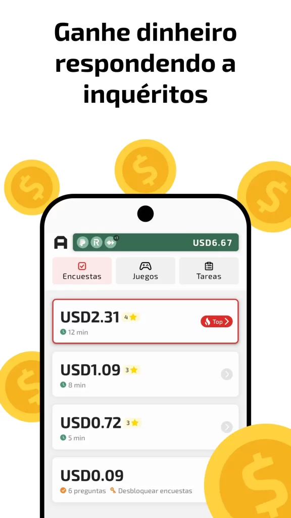 E, o melhor de tudo, é que ele é um app que paga em dólar quando você responde pesquisas ou cumpre tarefas como a instalação de aplicativos e jogos.
