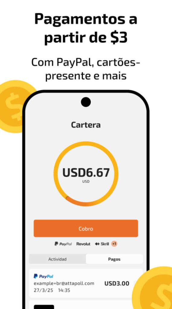 - Opções de saque: O AttaPoll paga por PayPal, Revolut ou Skrill. Você também pode resgatar cartões de presente para usar em lojas e serviços como Carrefour, Casas Bahia, Netflix e Uber, ou ainda doar para uma instituição de caridade.