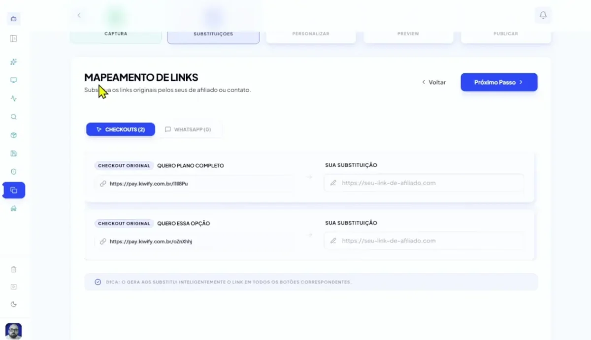 Após a captura, o próximo passo é mapear e substituir os botões de CTA (chamada para ação). Cada botão da página original possui um link de checkout específico. Sendo assim, você deve substituí-los pelos seus links de afiliado correspondentes.