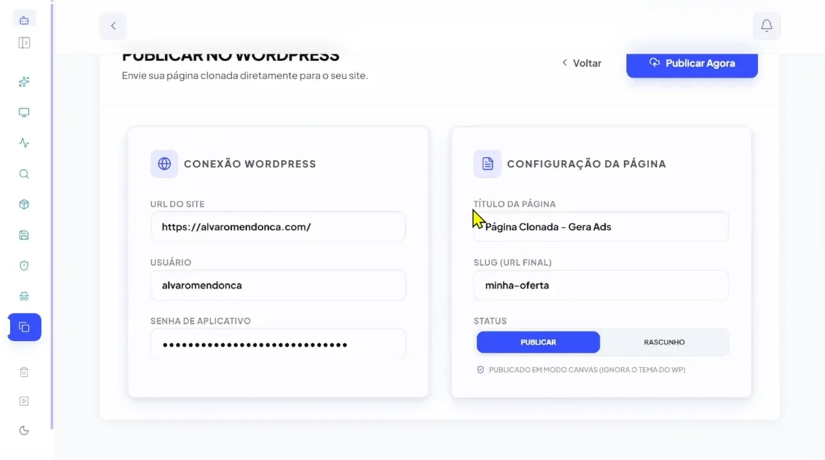 Por fim, basta conectar sua conta WordPress e publicar a página. Após inserir as credenciais do seu painel WordPress, a publicação leva cerca de 30 segundos.