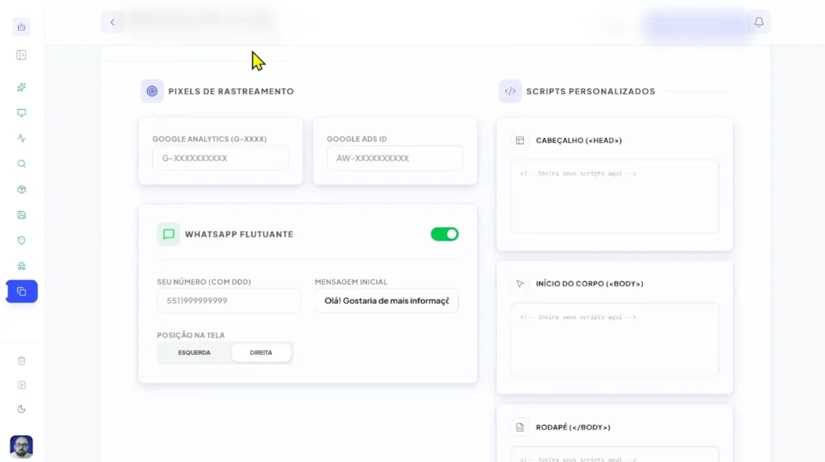 Nesta etapa, você pode adicionar pixels de remarketing, scripts personalizados e até um botão de WhatsApp flutuante. Esse recurso é especialmente útil para quebrar objeções. Afinal, muitos visitantes têm dúvidas antes de comprar. Ter um canal direto de atendimento pode aumentar significativamente a taxa de conversão.