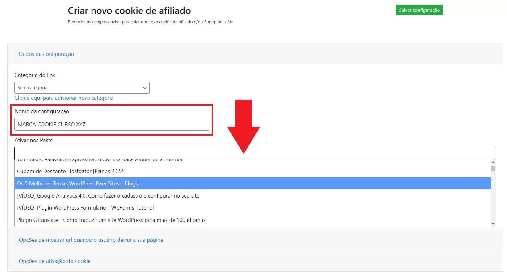 Em seguida, dê um nome para a configuração da marcação do cookie, clique em “Ativar nos posts” e escolha o post que você quer ativar seu cookie de afiliado.