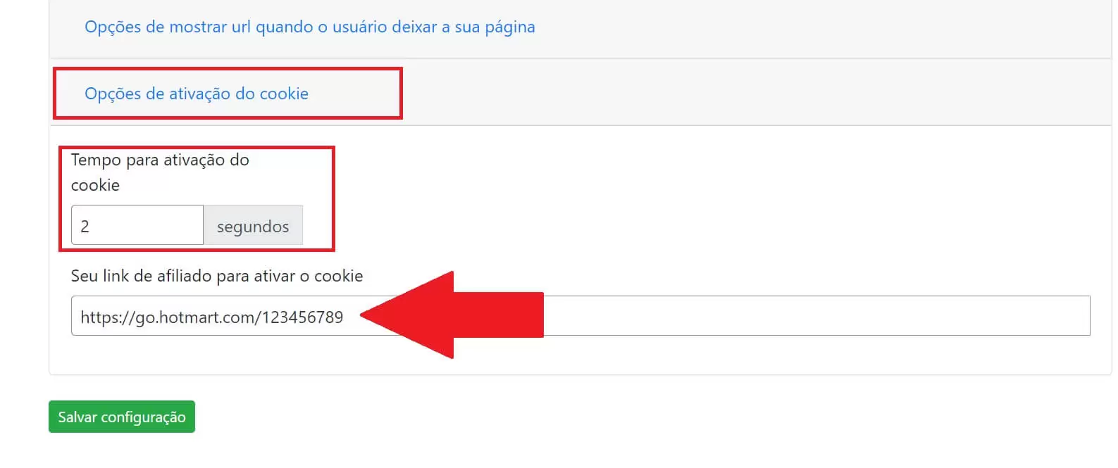 Como você pode ver na imagem acima, na opção “Tempo para ativação do cookie“, eu coloquei 2 segundos…